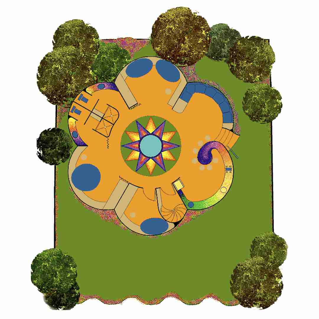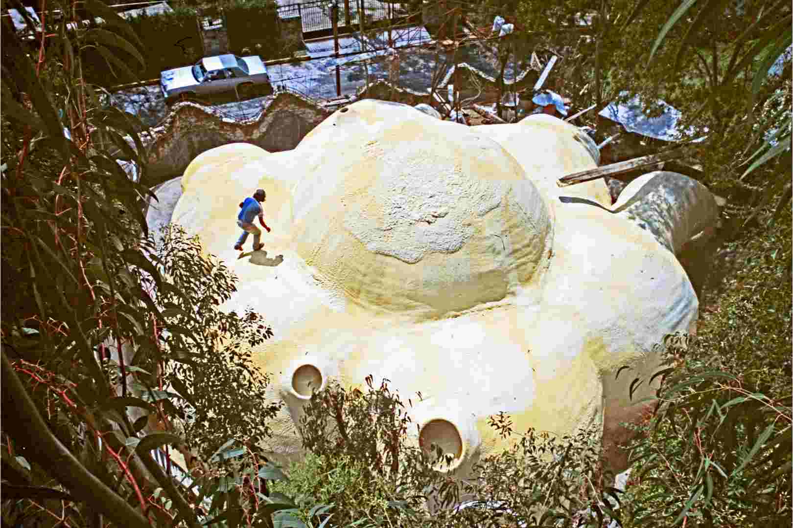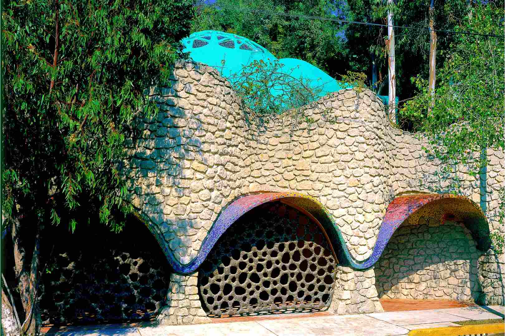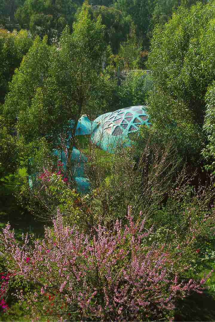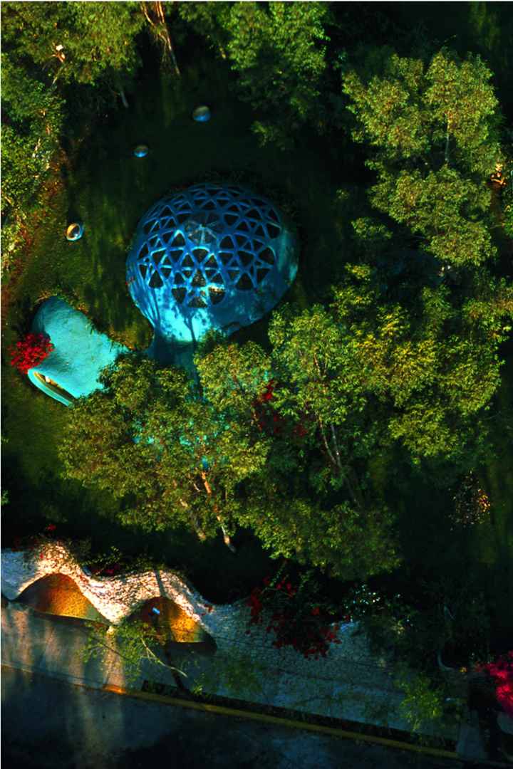 La espiral ascendente del acceso nos comunica con la casa situada a +3.00 m con respecto del nivel banqueta. La vivienda, cuya forma en planta asemeja a una flor de 6 pétalos, alberga en la corola una estrella de azulejos que envuelve, al centro, un jacuzzi, imagen-espejo de la estrella elaborada con vitrales en la cúpula.