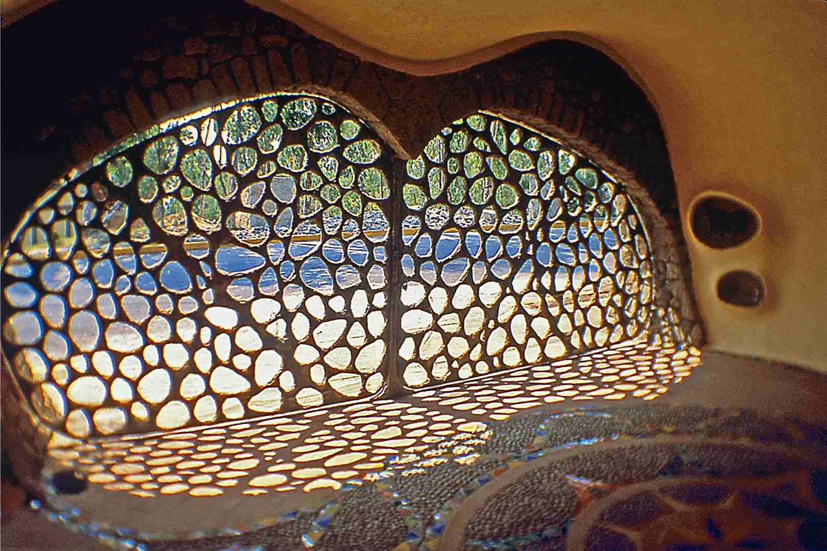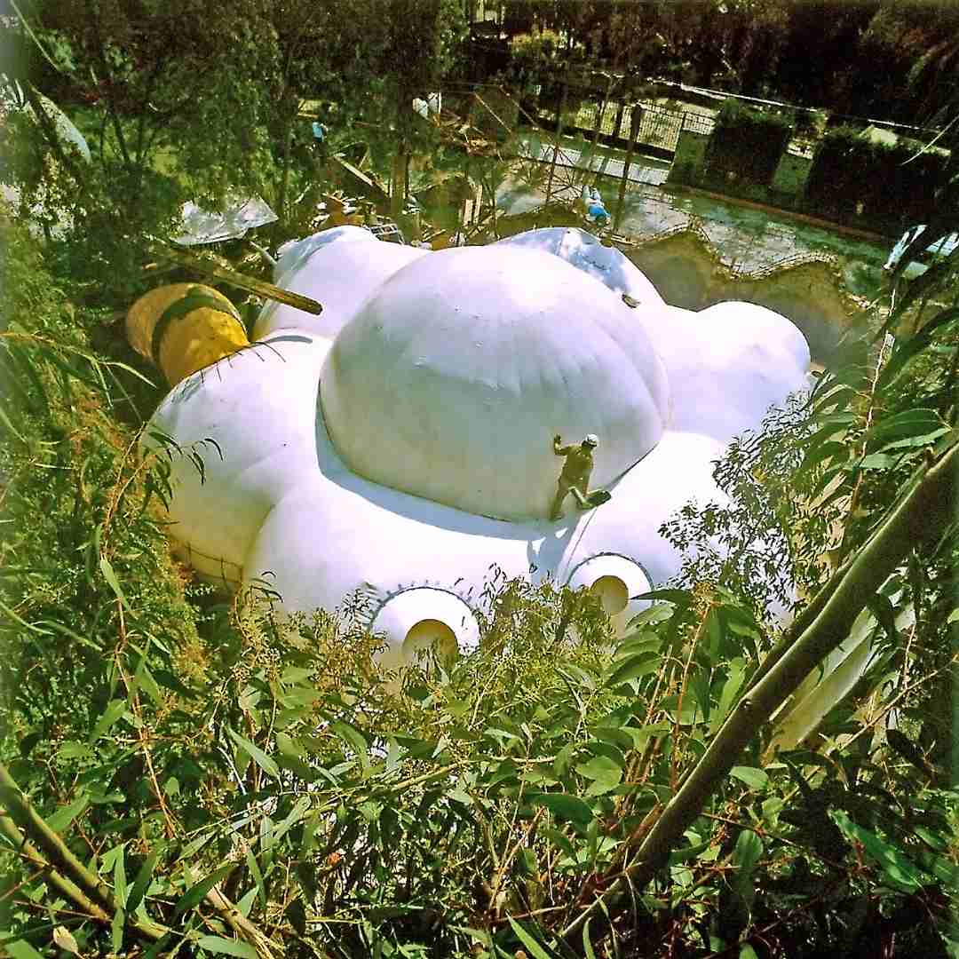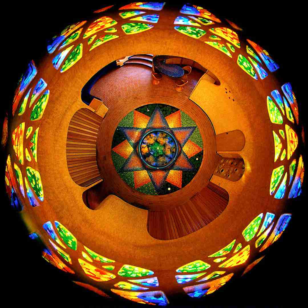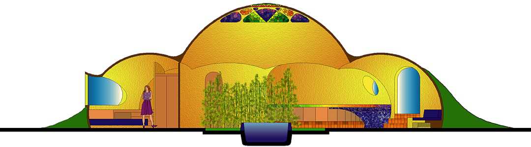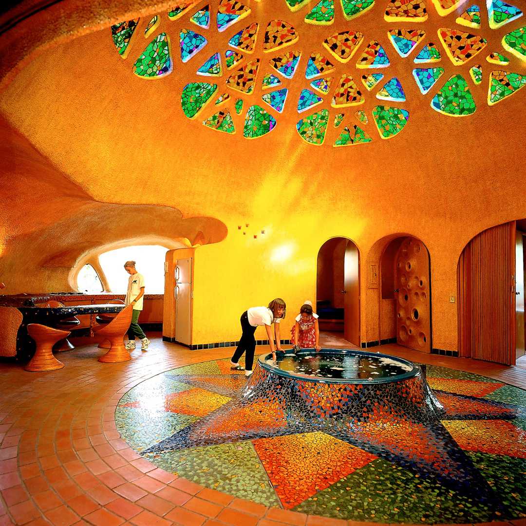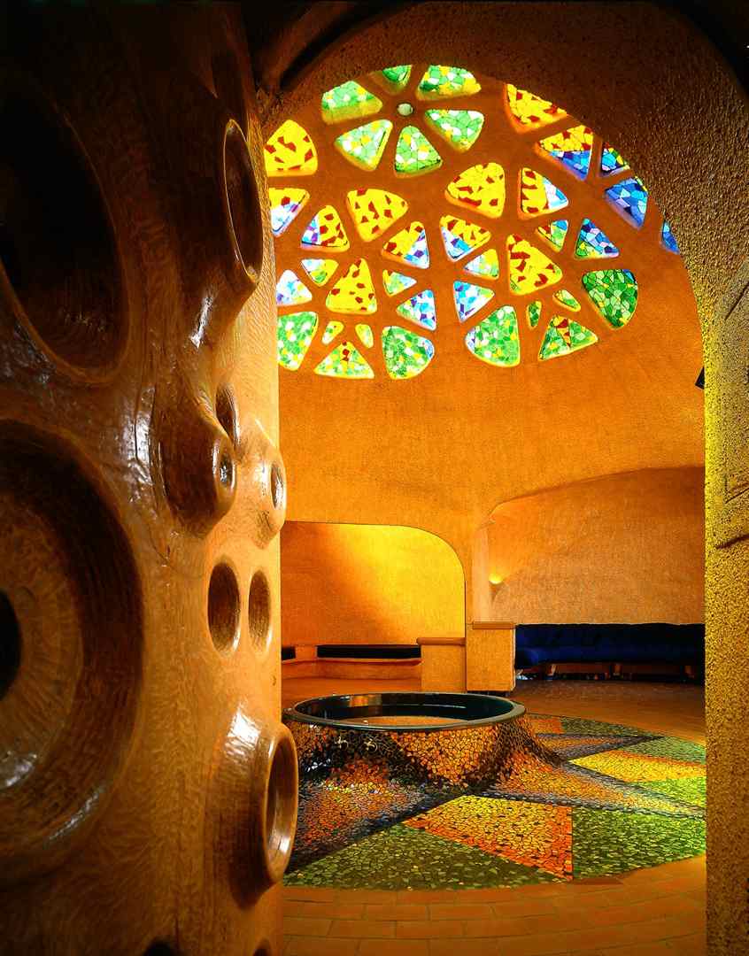 The ascending spiral of the entrance leads into a house raised three meters above sidewalk level. The plan of the house resembles a six-petal flower, with the corolla formed by a star of glazed tiles that contains a Jacuzzi at its center. The same star is created out of stained glass in the dome.