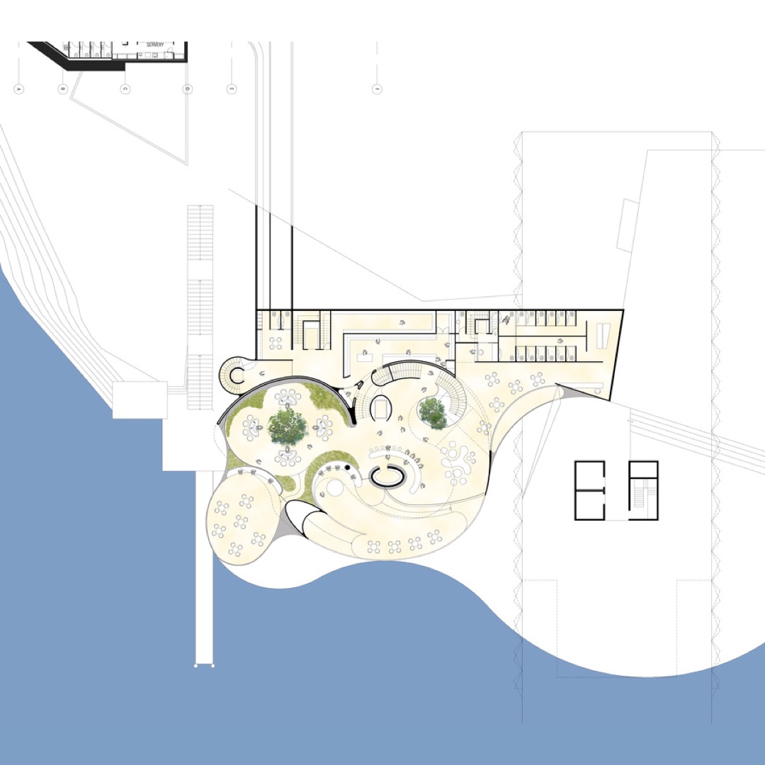Concebimos una cubierta continua que, en el corte longitudinal, parece la figura de una clave de Sol rotada 90° que genera todos los espacios de juego y de convivencia. Debido a la forma, se obtuvo una combinación de alturas que permite transiciones entre techos bajos y altos con vistas dirigidas hacia el río Derwent.