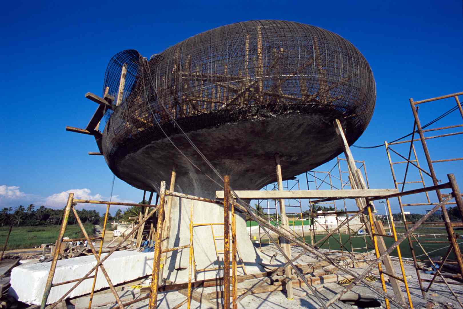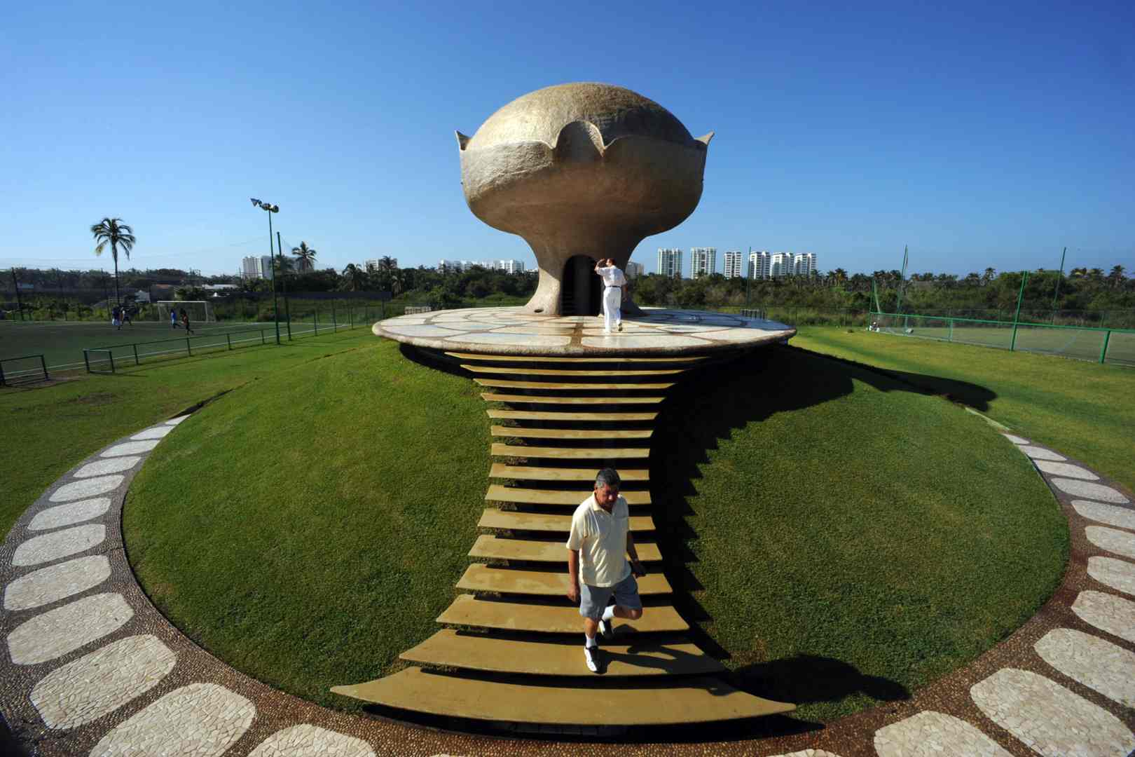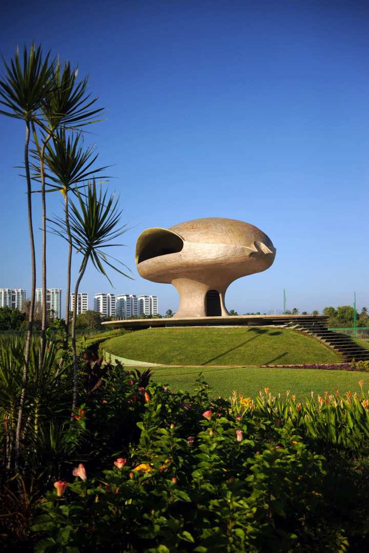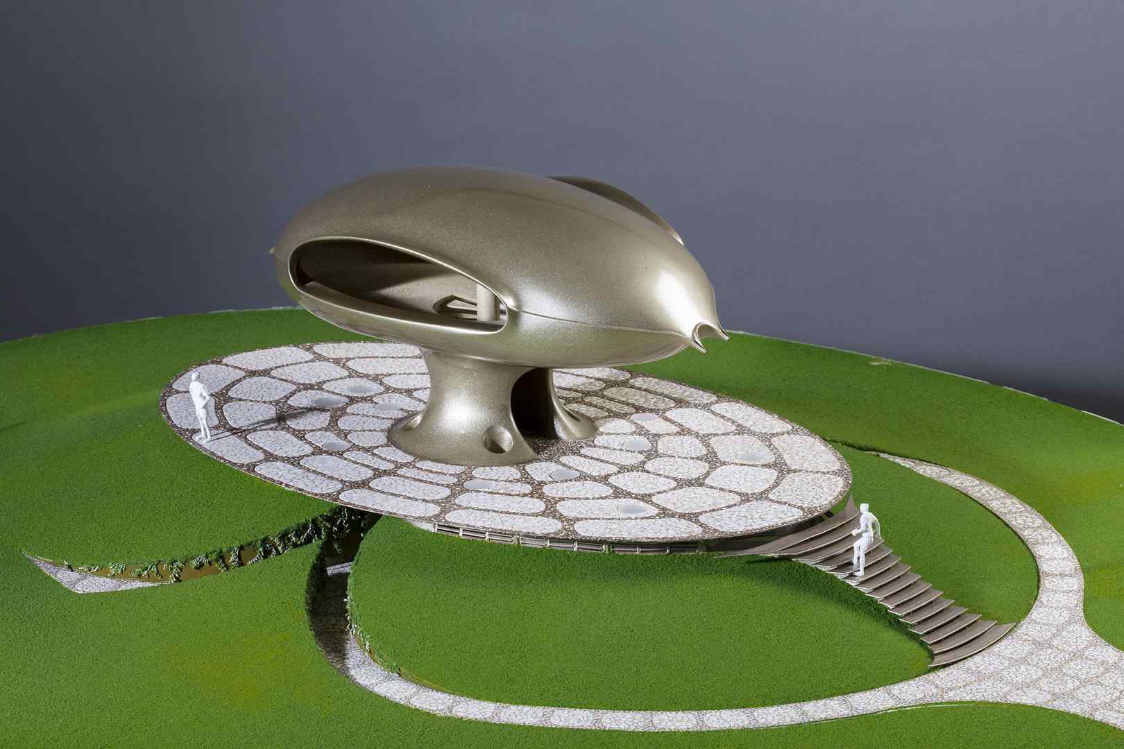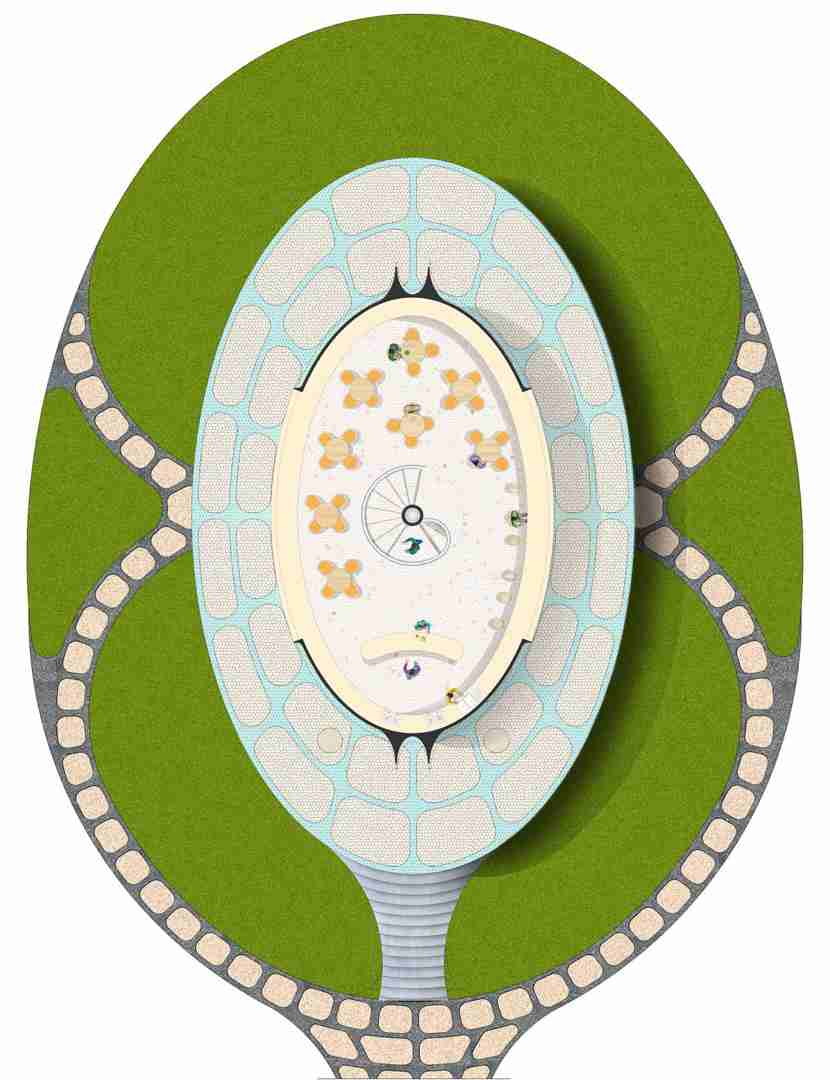 From this volume there emerges, out of the depths of the earth, and resting on a platform, a monumental structure that resembles a mushroom cloud, housing the cafeteria.