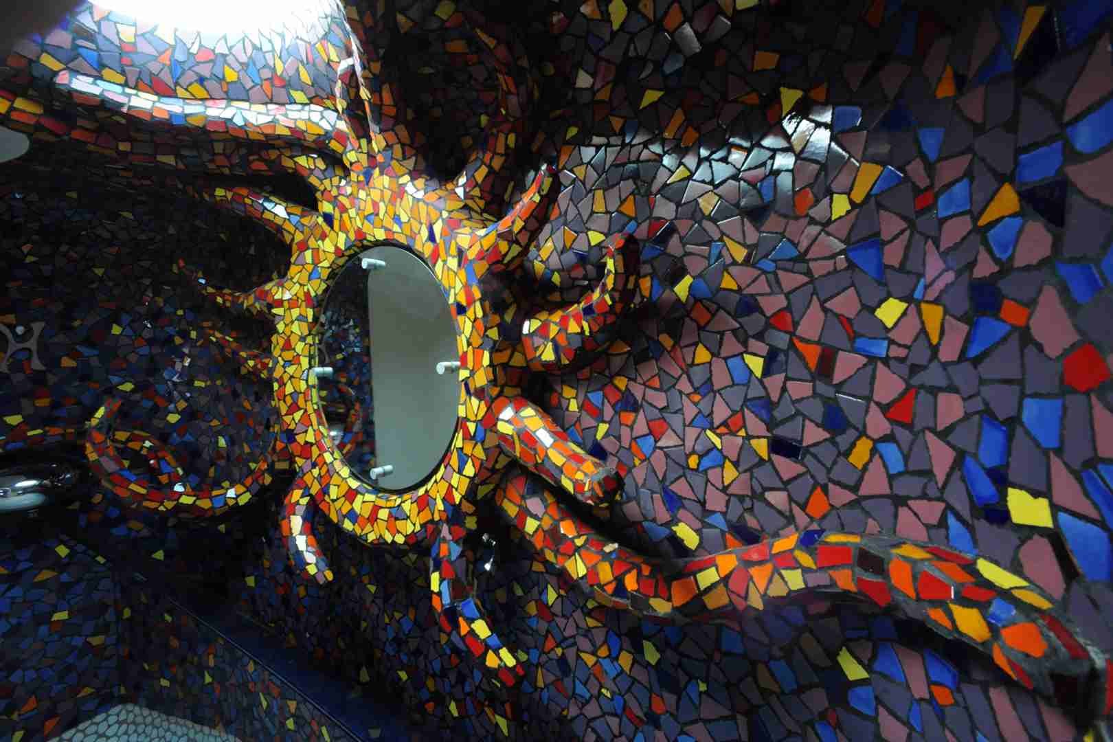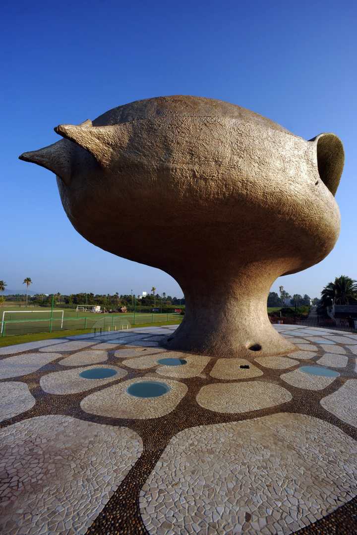 De esta edificación emerge del fondo de la tierra y de la plataforma, una estructura monolítica, un hongo (cafetería) semejante a una erupción.