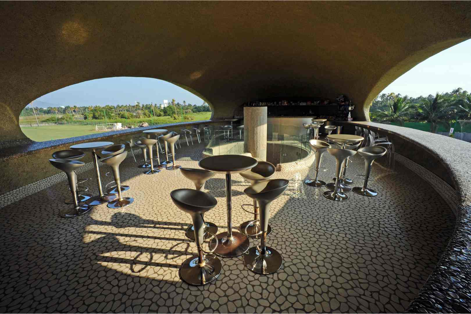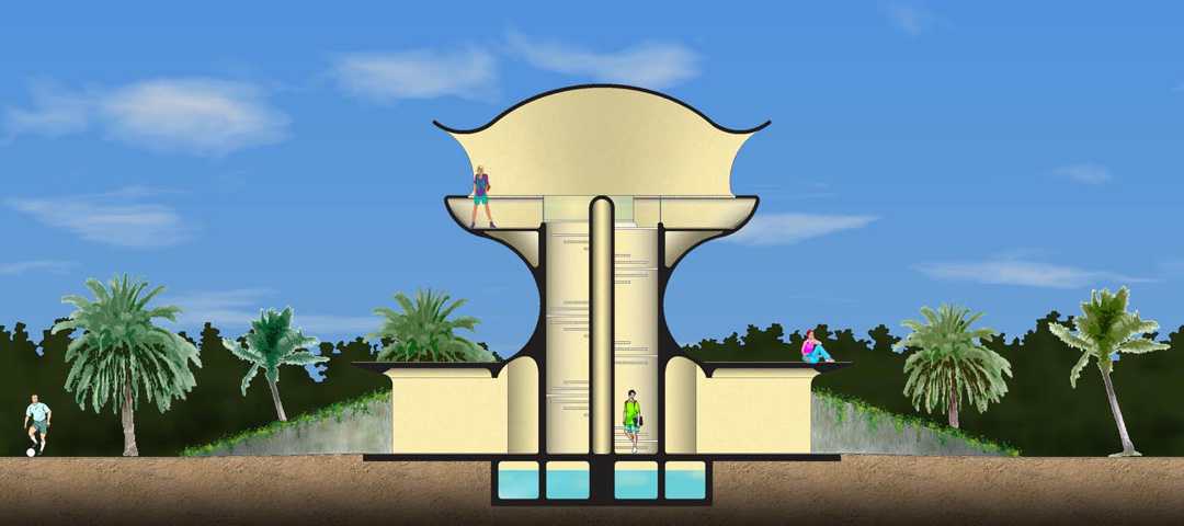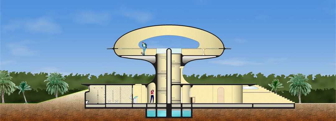 An oval volume contains the services, protected by a grassy mound that serves as insulation from the high temperatures of the region.