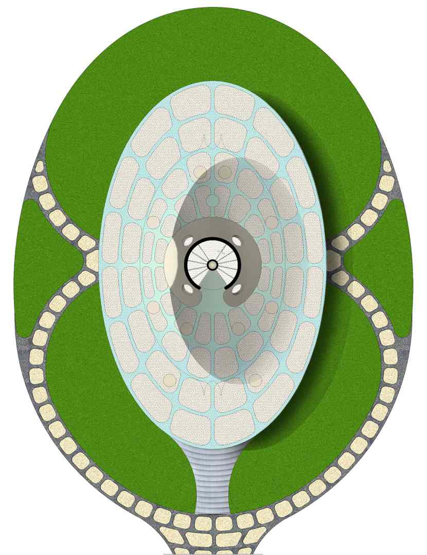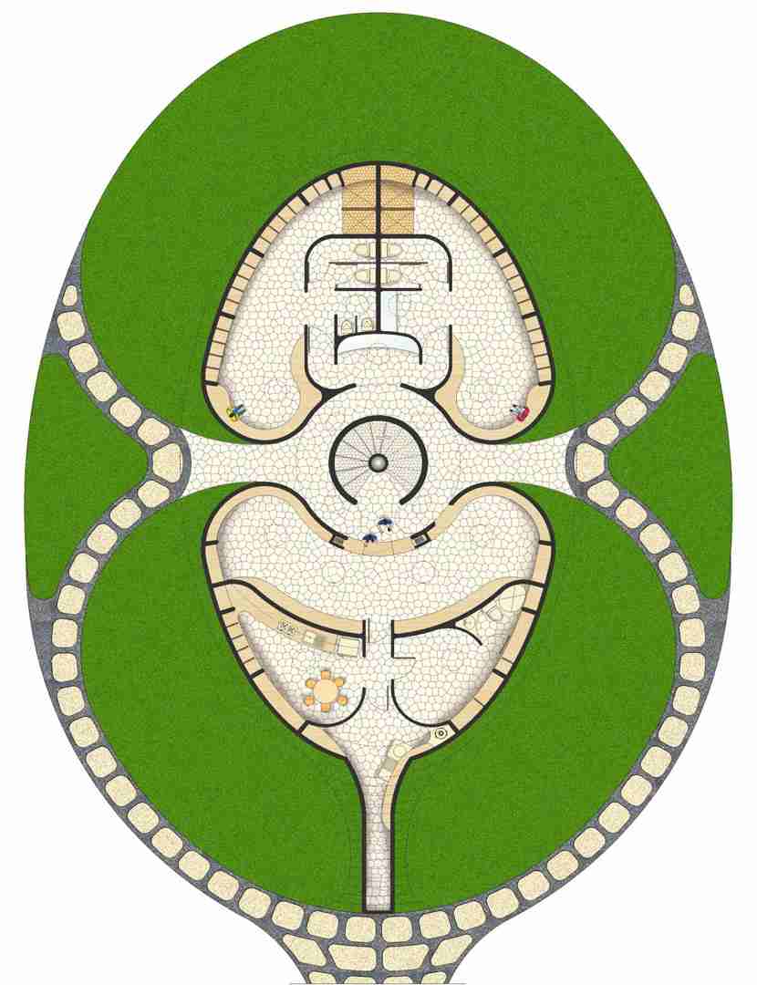 Un óvalo delimita los servicios protegidos por un talud de pasto que actúa como aislante térmico.