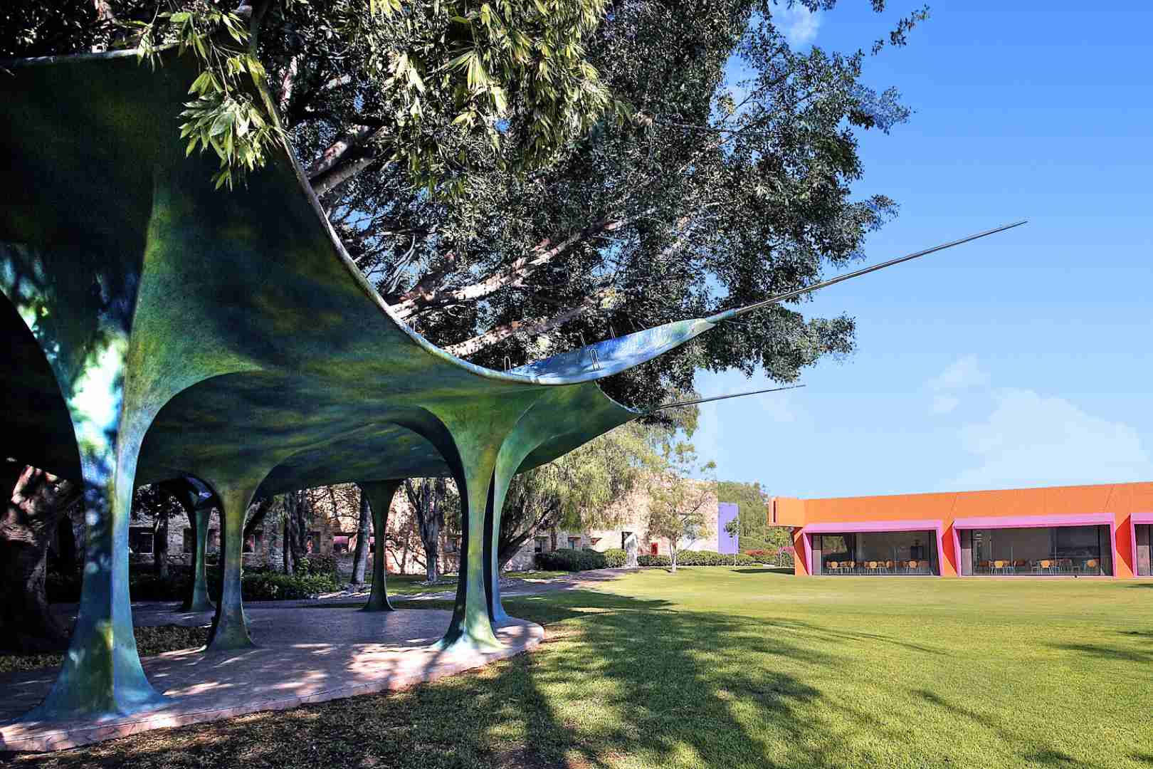 Esta armazón fué bautizada como el paraguas, porque independientemente de que cumple con los mismos objetivos, visualmente es semejante, creando con las nervaduras una ondulante superficie, con orificios en el piso para regar las raíces y abierta al centro para dar paso al tronco del enorme Laurel de la India.