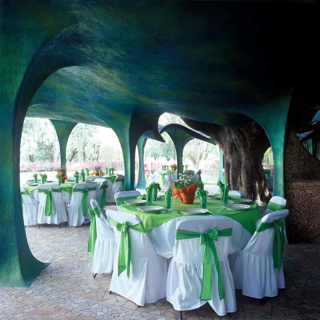 Dentro de los jardines de una planta farmacéutica se eligió un espacio al aire libre en donde pudieran realizarse eventos y comidas.