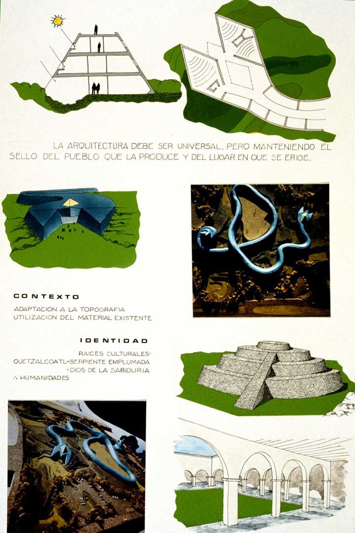 En un terreno con lava volcánica cerca de la pirámide circular de Cuicuilco en Ciudad Universitaria, se desarrolló este anteproyecto de doce institutos interdisciplinarios. El acceso a cada instituto es por el circuito de autos, los estacionamientos se localizan a un lado de los institutos, siguiendo la topografía del lugar; los muros inclinados que se aprecian en el corte se construyen con la misma lava volcánica que se remueve para desplantar el edificio.