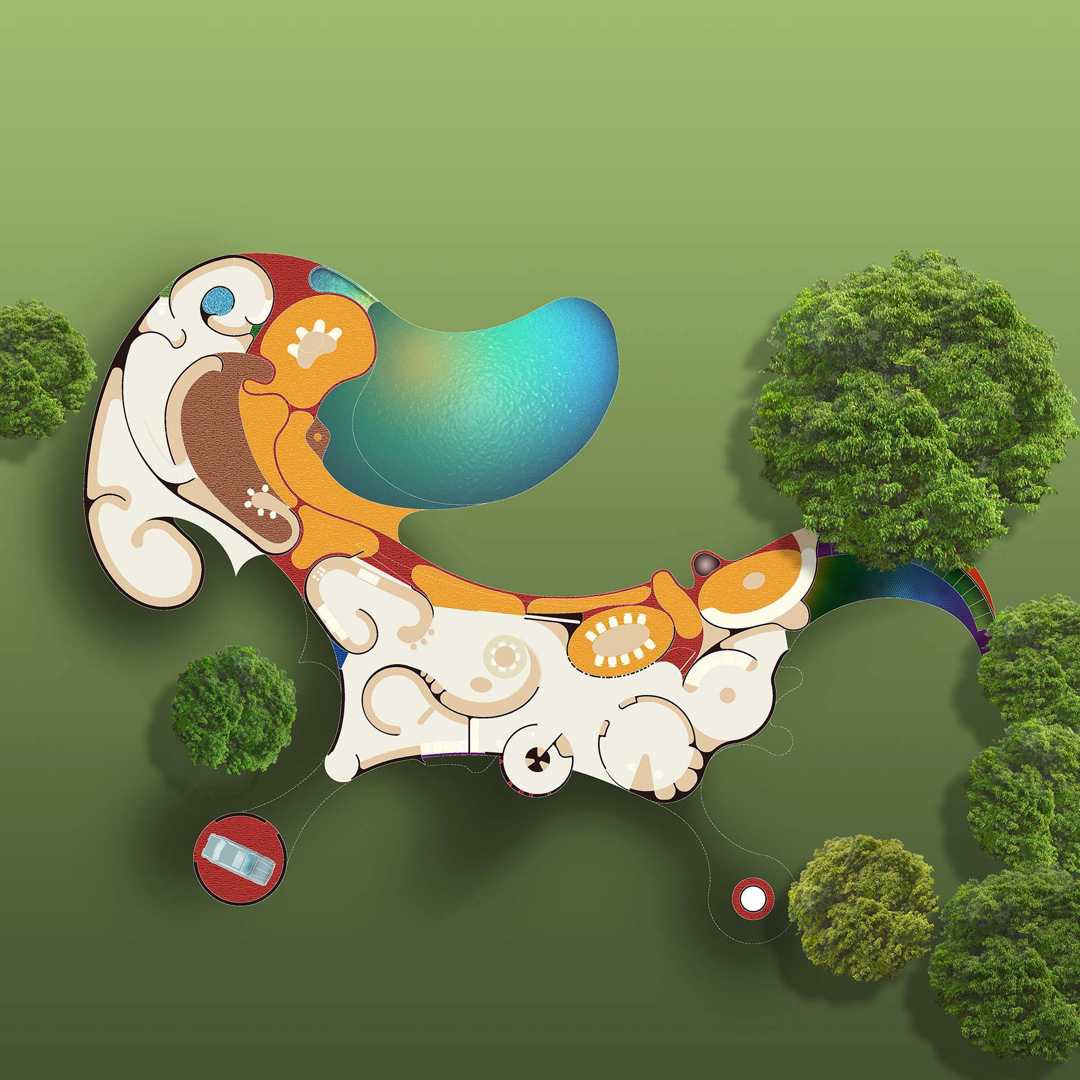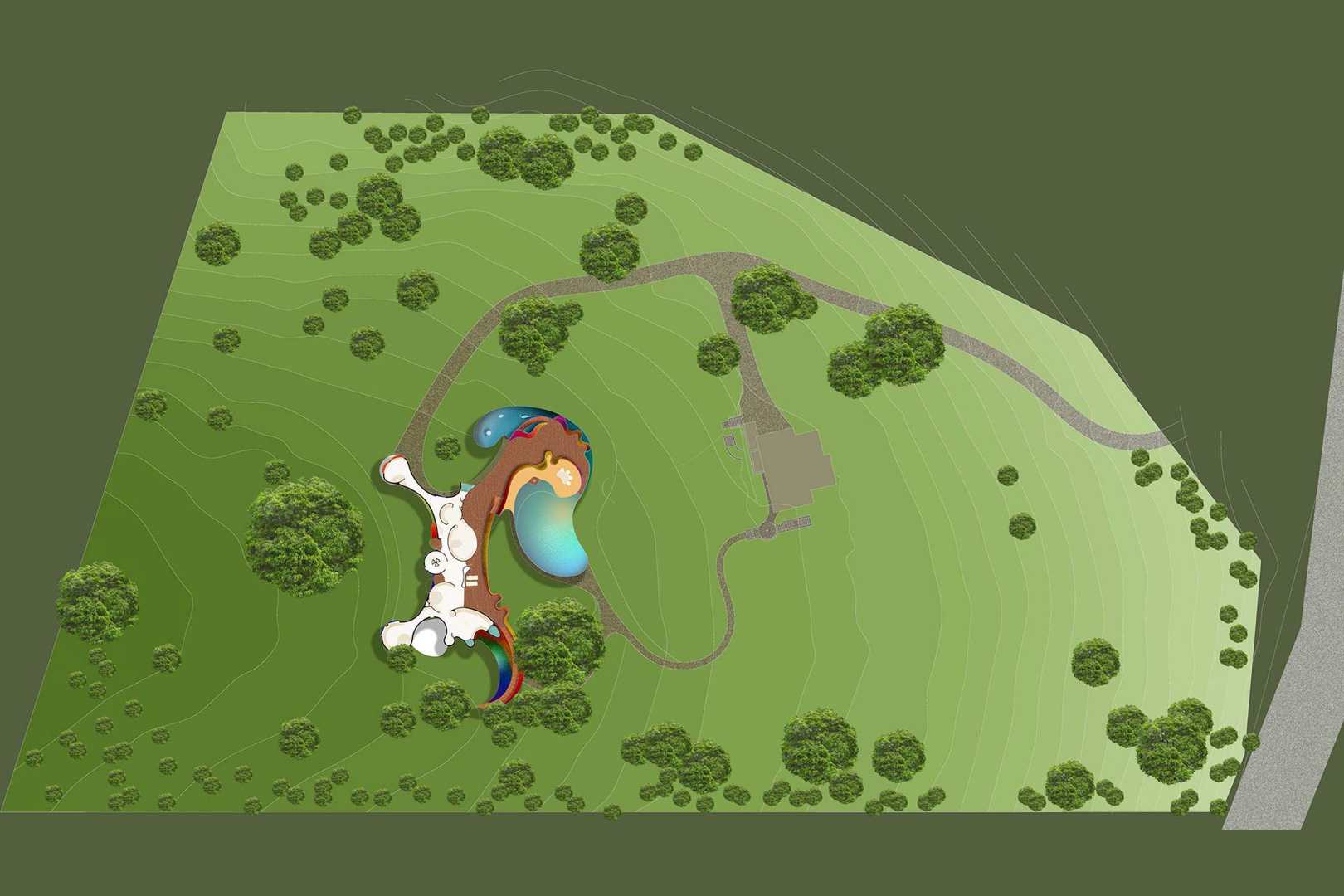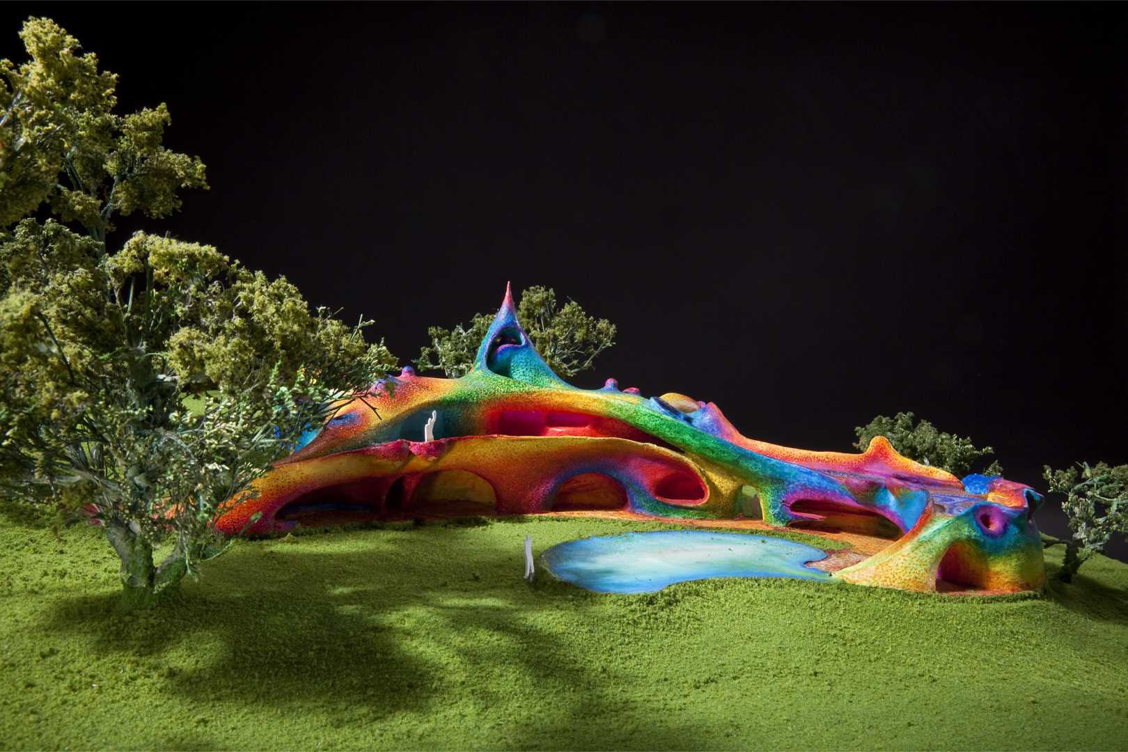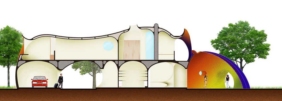 From the beginning, we thought the program demanded a house in the form of a large, colorful sculpture, decorated with glazed ceramic tiles and endowed with cross-ventilation, niches for sculptures, and large open-air spaces.