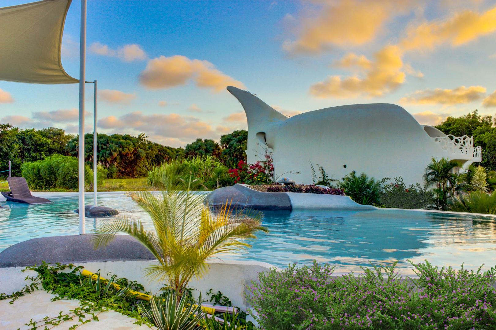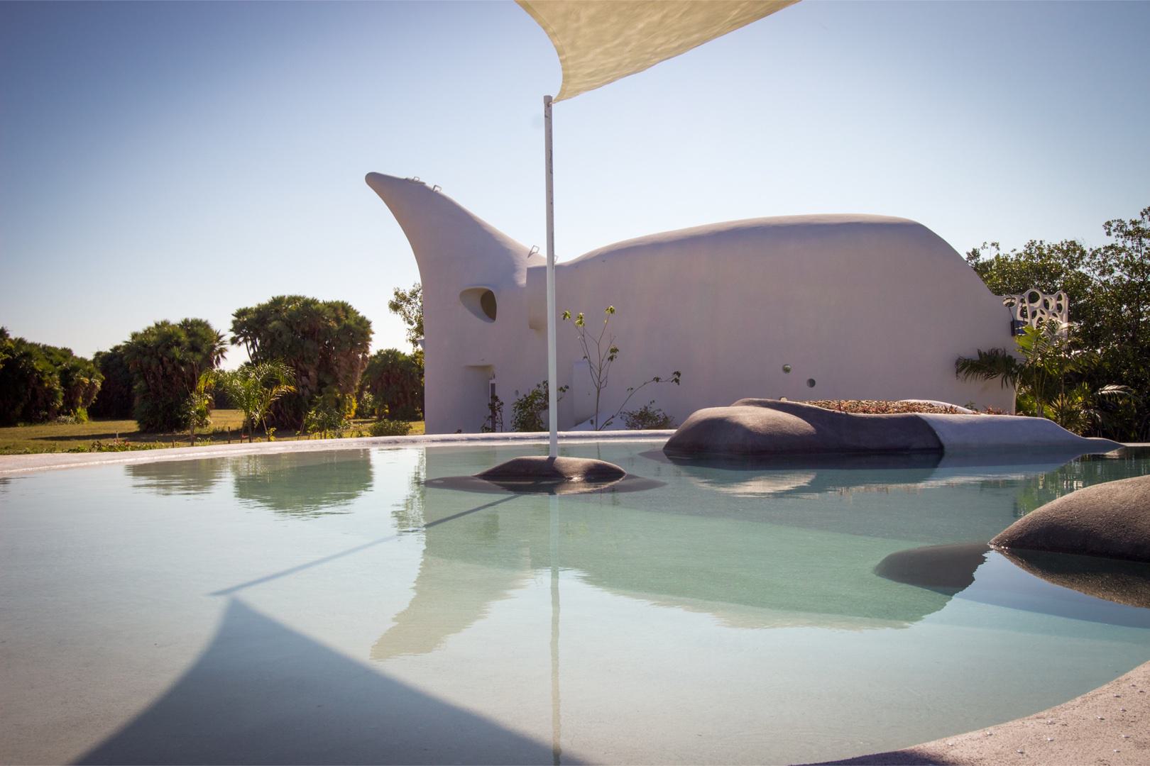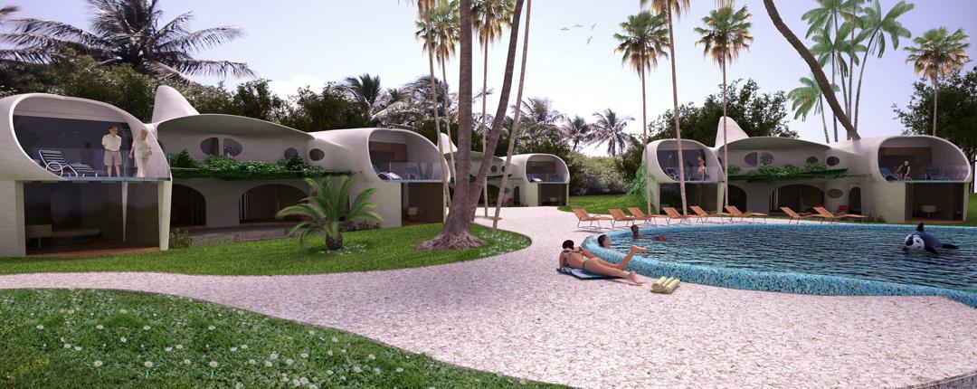 El depósito de agua se incorpora a la edificación simulando el pescuezo de un cisne, por eso los propietarios decidieron nombrar al conjunto Swan Villas. En el exterior hay una zona común de convivencia con alberca al centro.