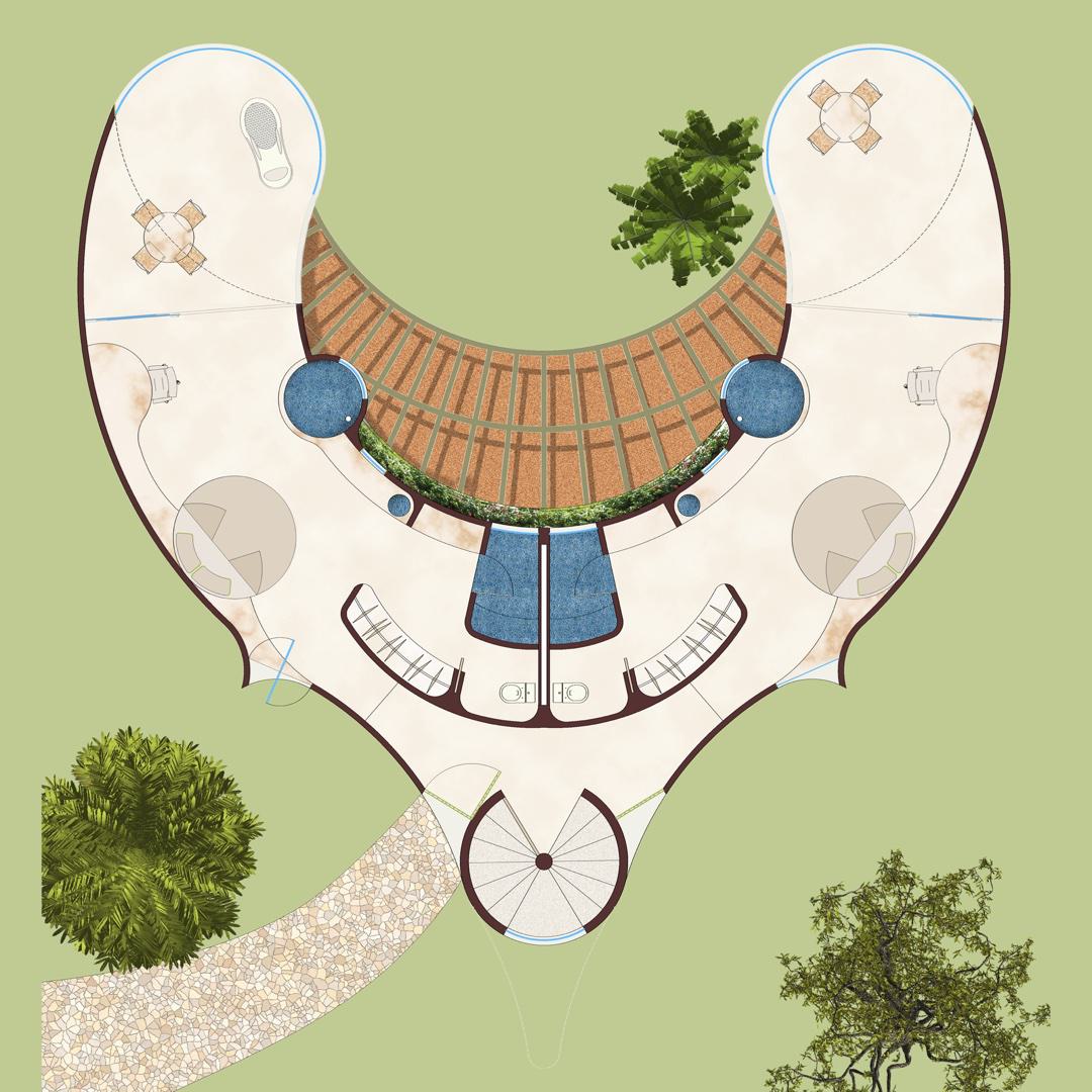 The cross-ventilation in all the spaces is a basic feature of the design, along with the porticoed terrace that offers vistas of the surroundings.