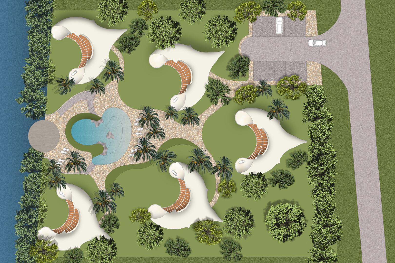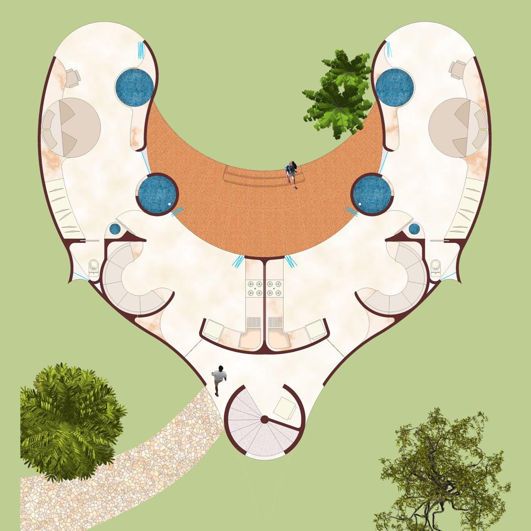 The water tank is incorporated into the structure, in the shape of a swan’s neck, which is why the owners decided to call the complex Swan Villas. On the outside, there is a common area located around the central swimming pool.