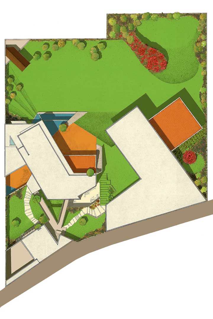 The design of the Saratoga house, adapted to the irregular topography of the lot, makes the most of its southern exposure and intercrossing vistas over the common garden.
