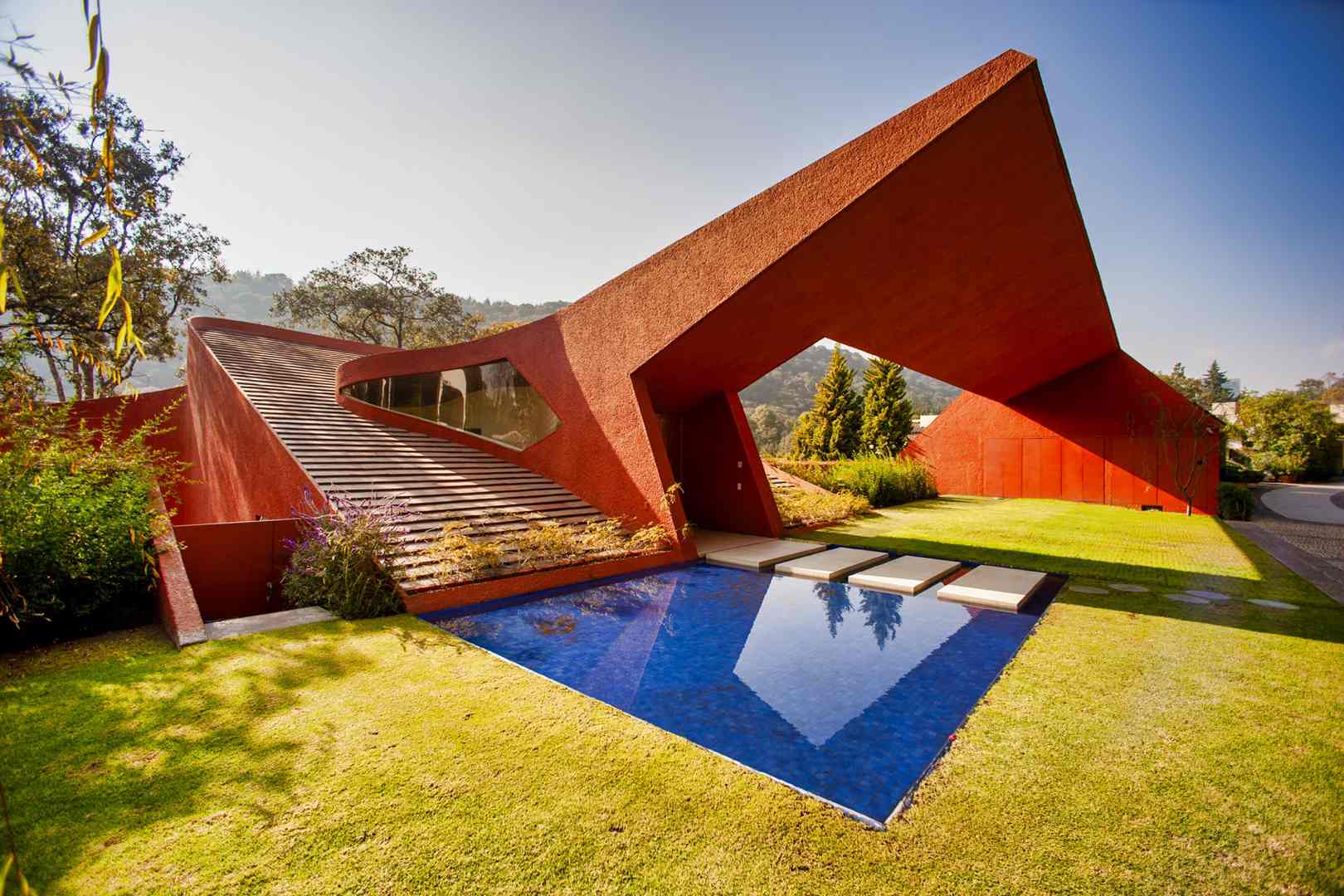 Al frente del terreno, con orientación norte, se acentuó el acceso peatonal con unas huellas sobre un espejo de agua y un volado tipo mariposa que se prolonga con la cubierta del estacionamiento. Los techos inclinados se pensaron, en un principio, como azoteas verdes revestidas con vegetación, sin embargo, el comité de construcción del fraccionamiento no lo permitió.