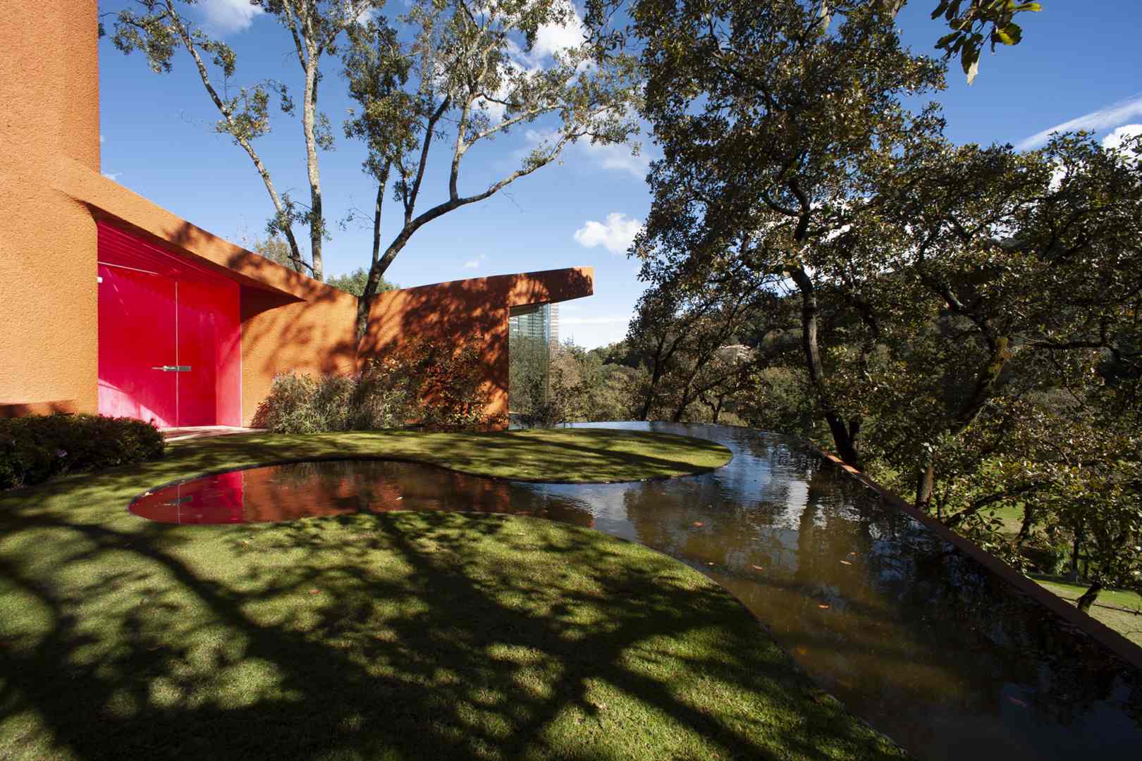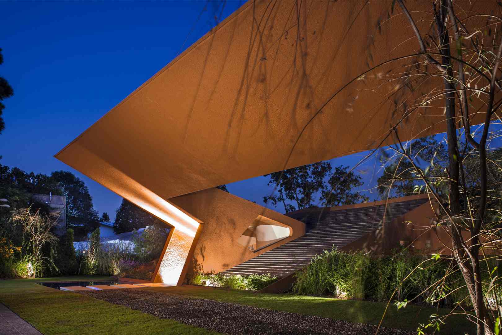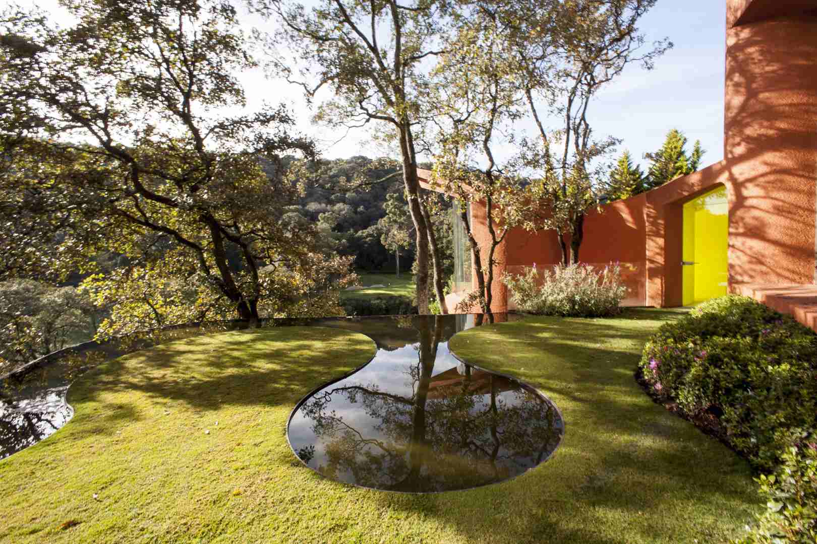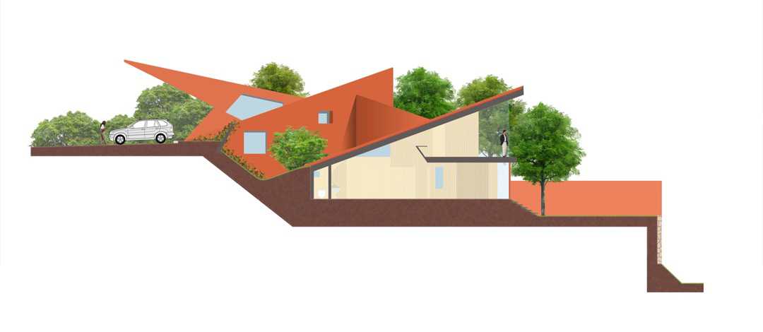En el fondo del terreno se encontró un pequeño encinar, con la idea de conservarlo, se trazó en un bosquejo una línea sinuosa para envolverlo, abrazarlo mediante las recamaras, los estudios y enfrentarlo con las zonas públicas. La casa le dio la espalda al norte con tres cubiertas inclinadas independientes que parecen surgir del terreno y se entrelazan a las recamaras por medio de dos pasillos angostos con vistas profundas a las zonas verdes.