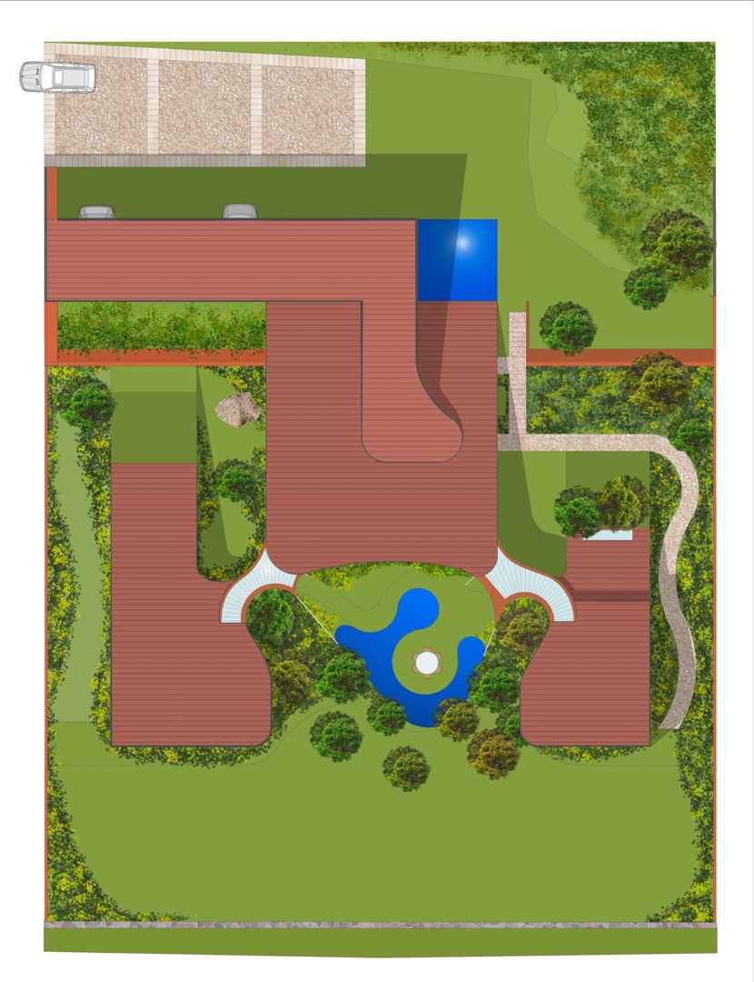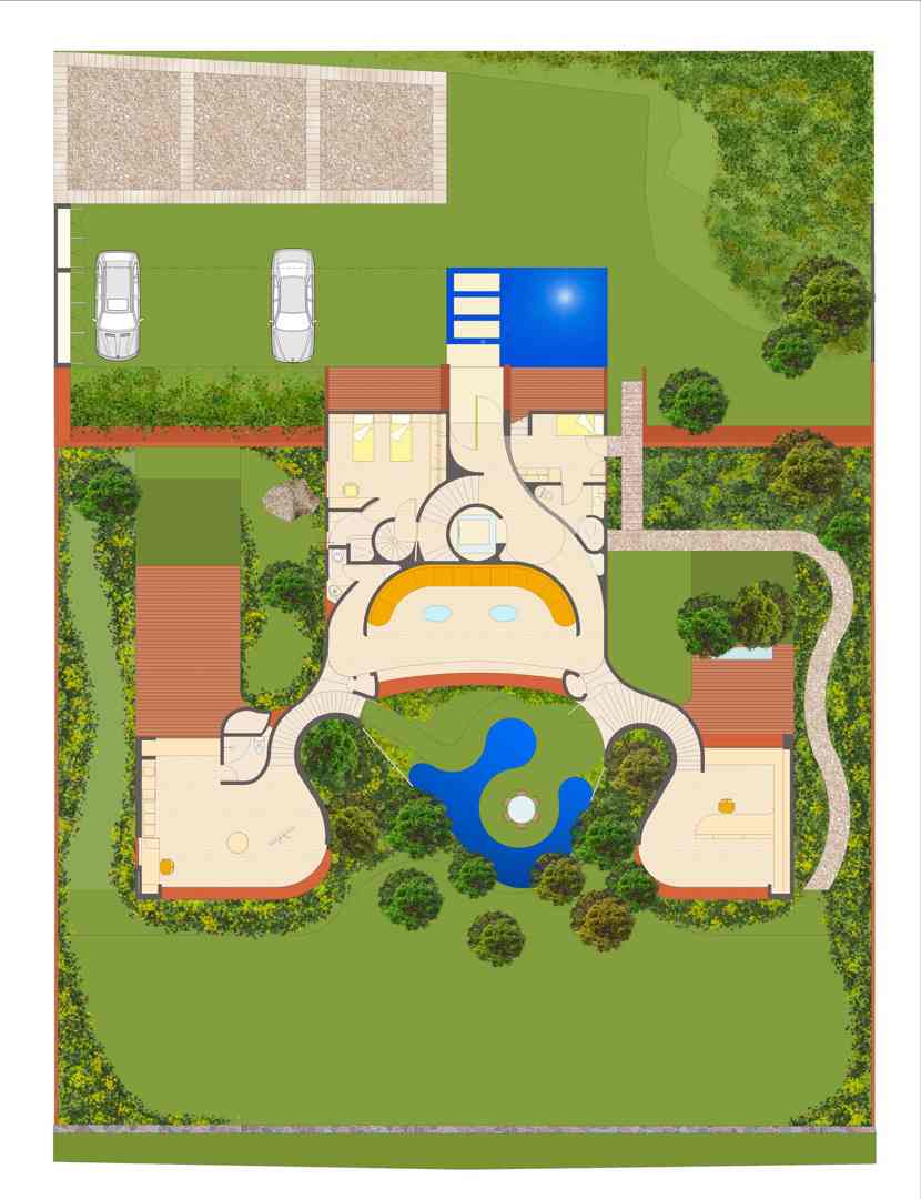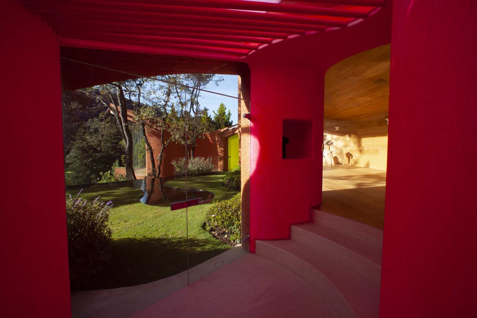 En el fondo del terreno se encontró un pequeño encinar, con la idea de conservarlo, se trazó en un bosquejo una línea sinuosa para envolverlo, abrazarlo mediante las recamaras, los estudios y enfrentarlo con las zonas públicas. La casa le dio la espalda al norte con tres cubiertas inclinadas independientes que parecen surgir del terreno y se entrelazan a las recamaras por medio de dos pasillos angostos con vistas profundas a las zonas verdes.