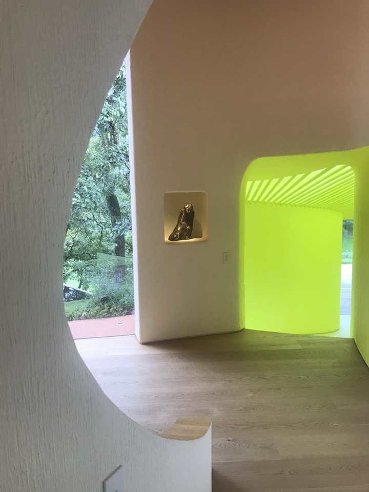 Geographical factors –topography, orientation, trees, views, physical surroundings– determined the concept of the house, which is adapted to the natural slope of the lot. Toward the back of the lot, large windows face south to offer views of a golf course and an oak grove, which is enveloped and protected by a sinuous line tracing the layout of the bedrooms, studies, and public areas.
