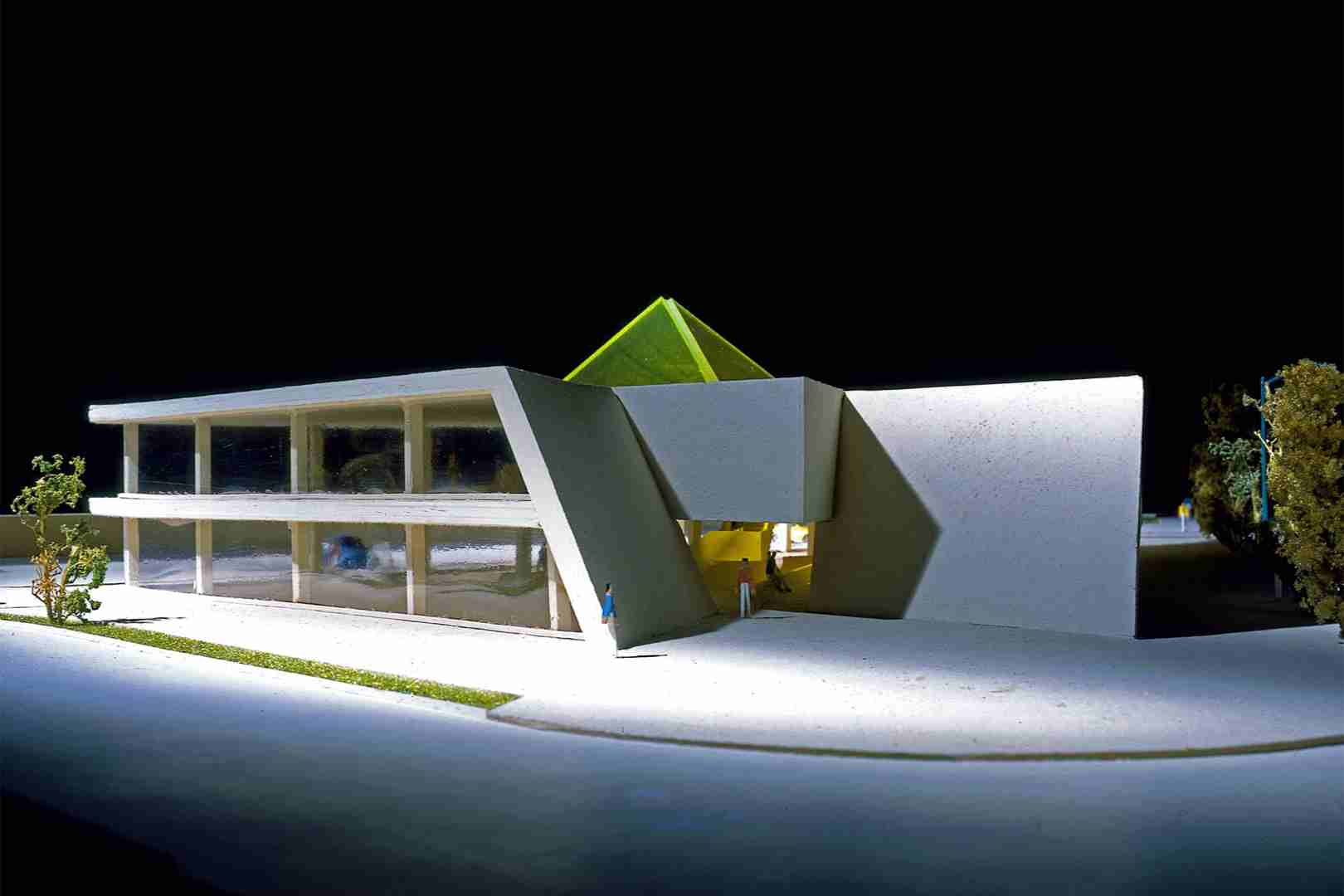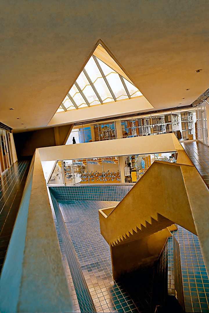 The main entrance, located at the angle of the two avenues, leads to a triangular double-height lobby illuminated by a pyramidal dome.