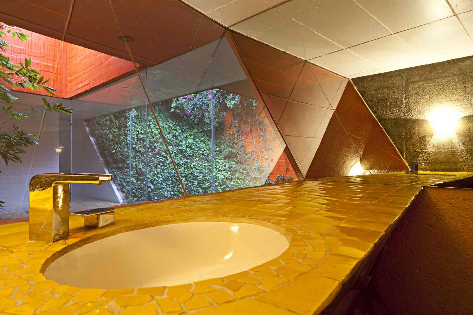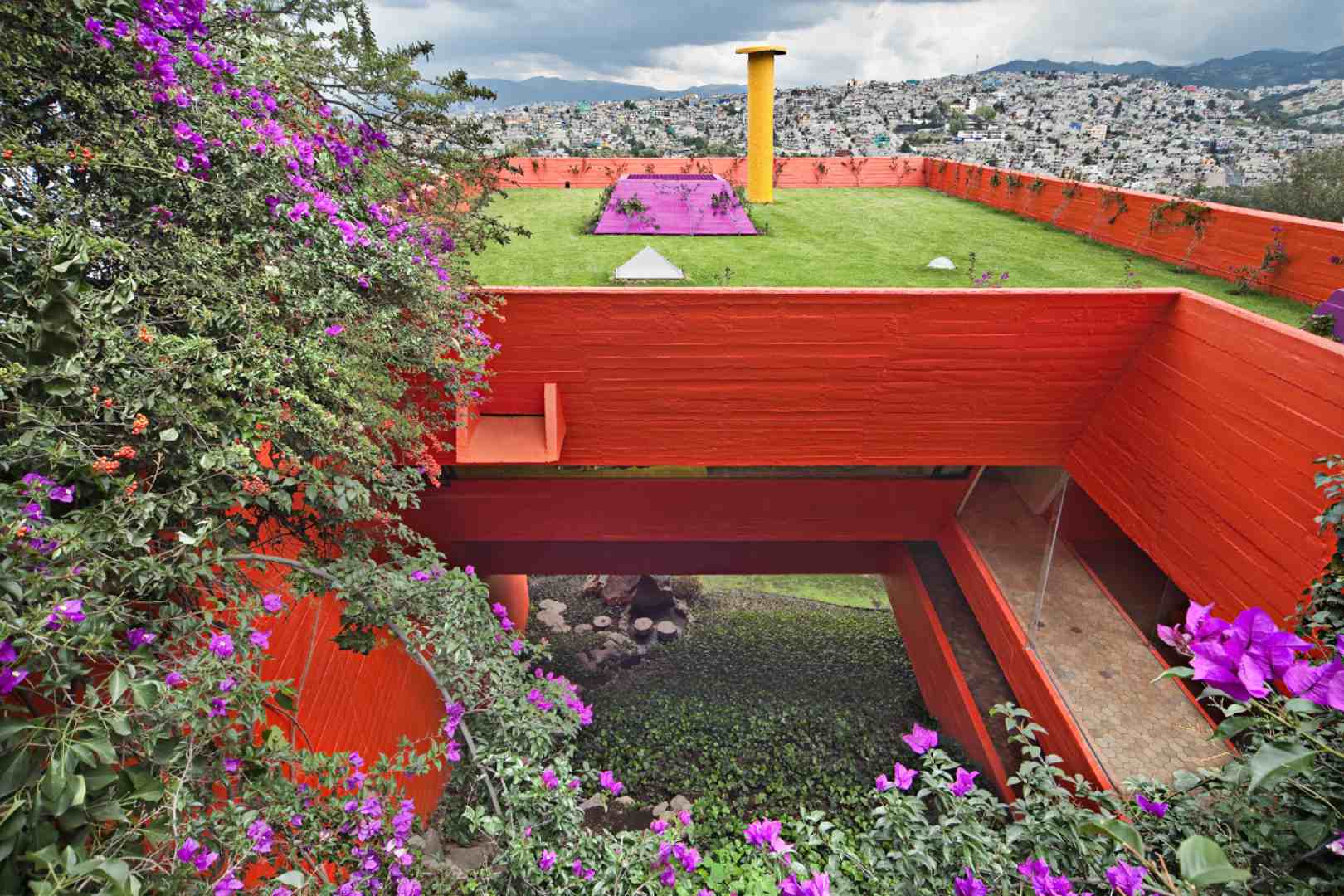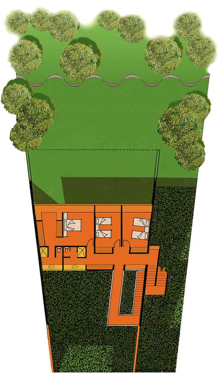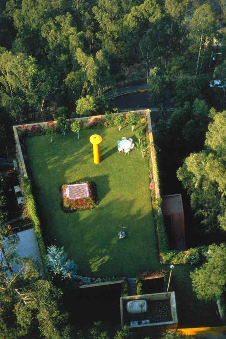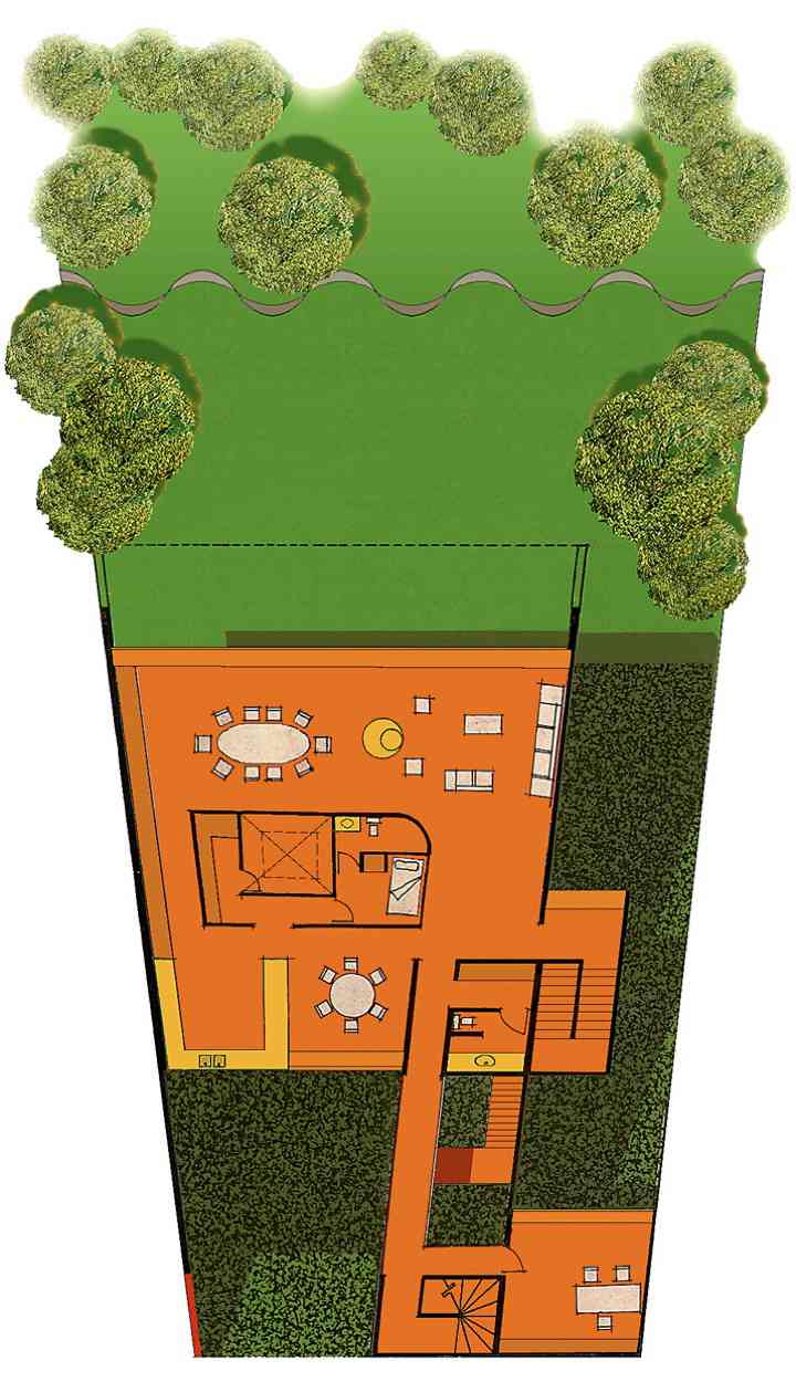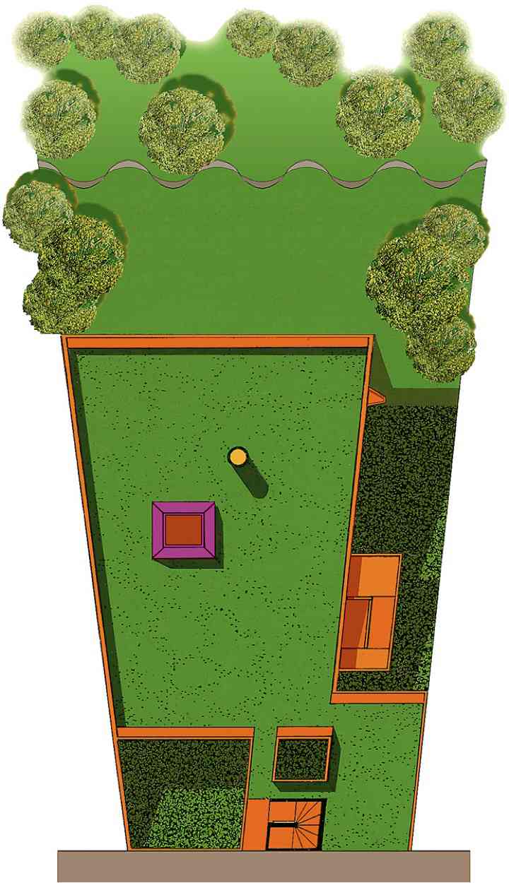 La construcción se apoya en un 3% de la superficie del terreno. Si se suma el área verde del terreno natural sin construir a la extensión del jardín de la azotea, nos da un área verde de 900m2 en un terreno de 600m2.