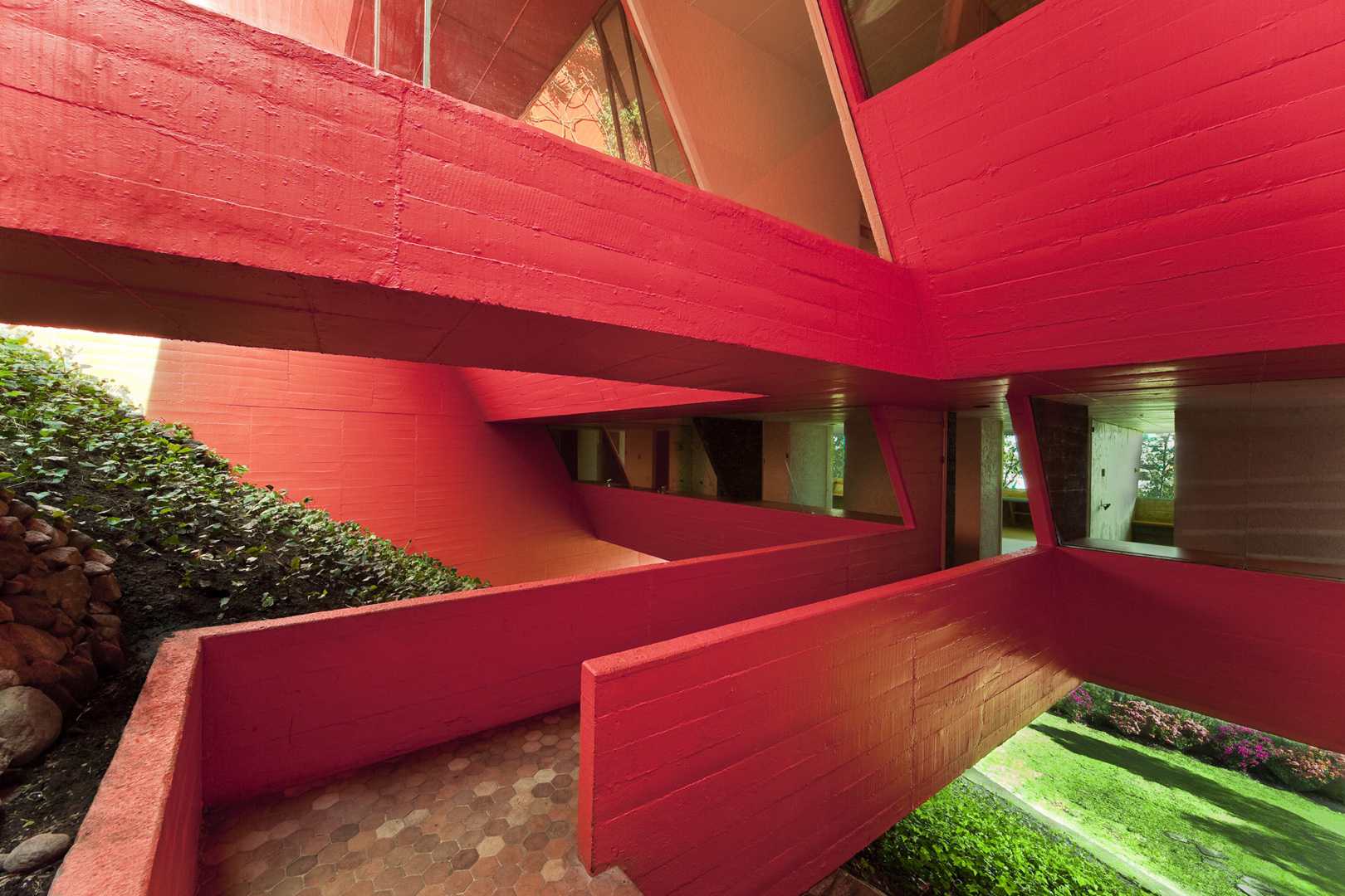 El programa de necesidades y las condicionantes geográficas del lugar – vistas, la gran pendiente del terreno y la necesidad de evitar grandes rellenos y muros de contención -, dieron como resultado la forma de una pirámide invertida, que está apoyada como puente en dos grandes muros que salen del terreno.