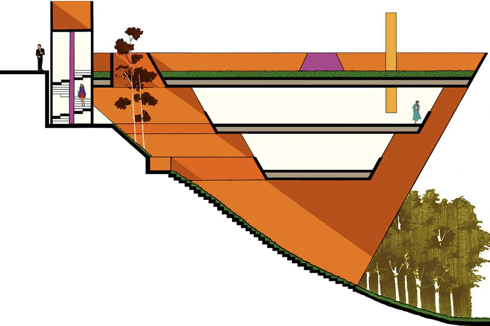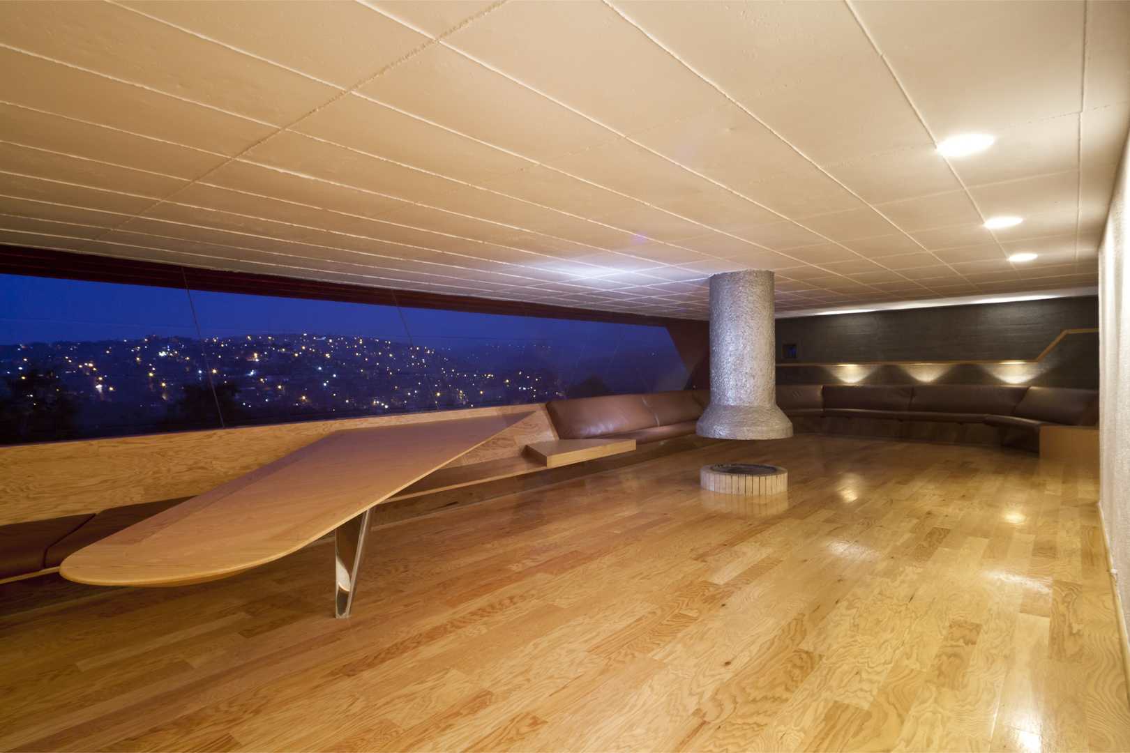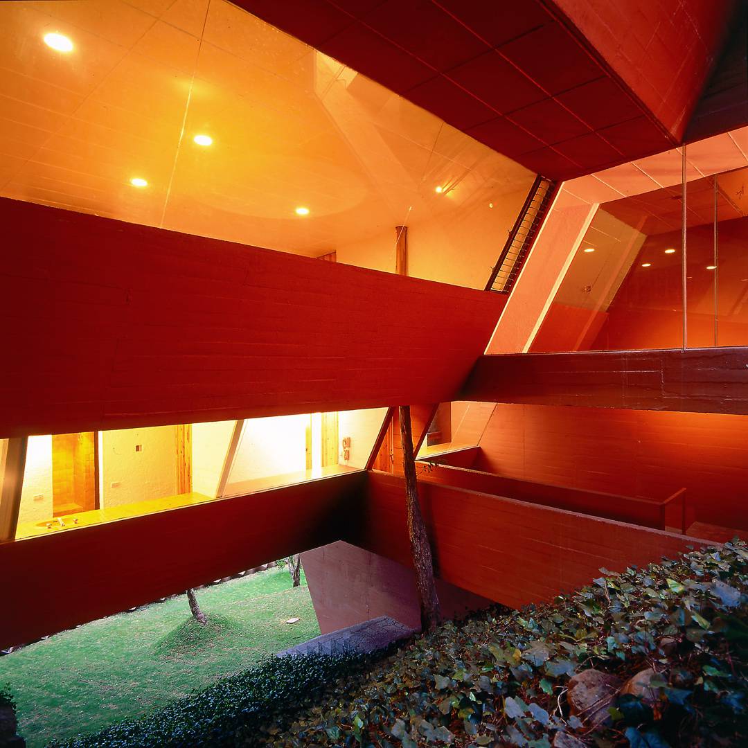 The programmatic requirements and the geographical conditions of the site –panoramic views, a steeply sloping terrain, and the need to avoid extensive digging and large retaining walls– resulted in the form of the inverted pyramid, which rests as a bridge on two walls emerging from the ground.