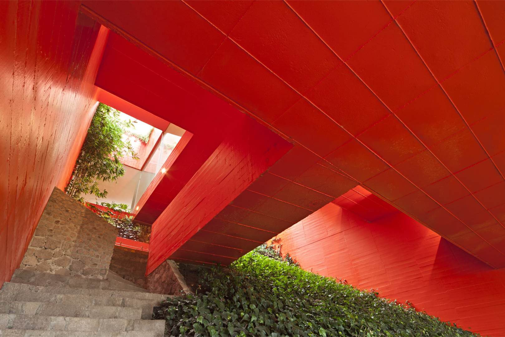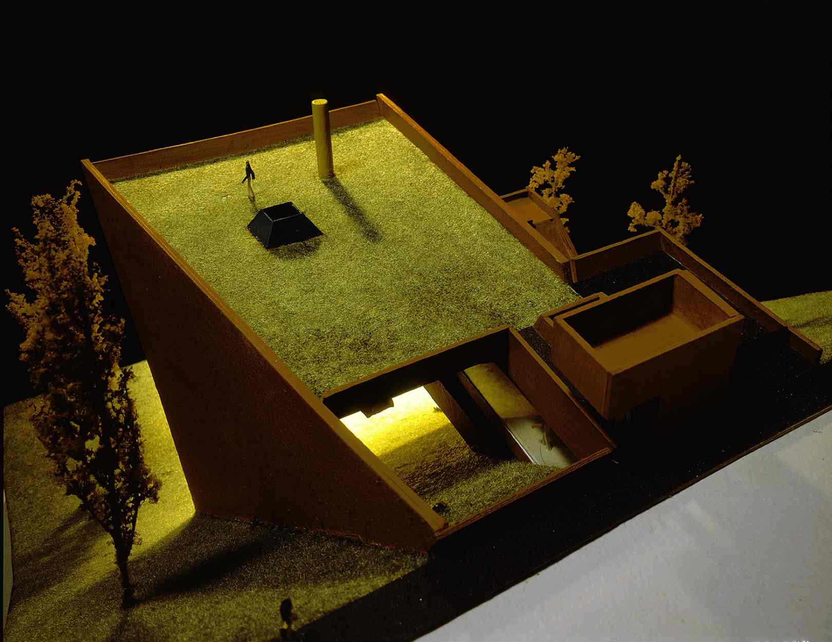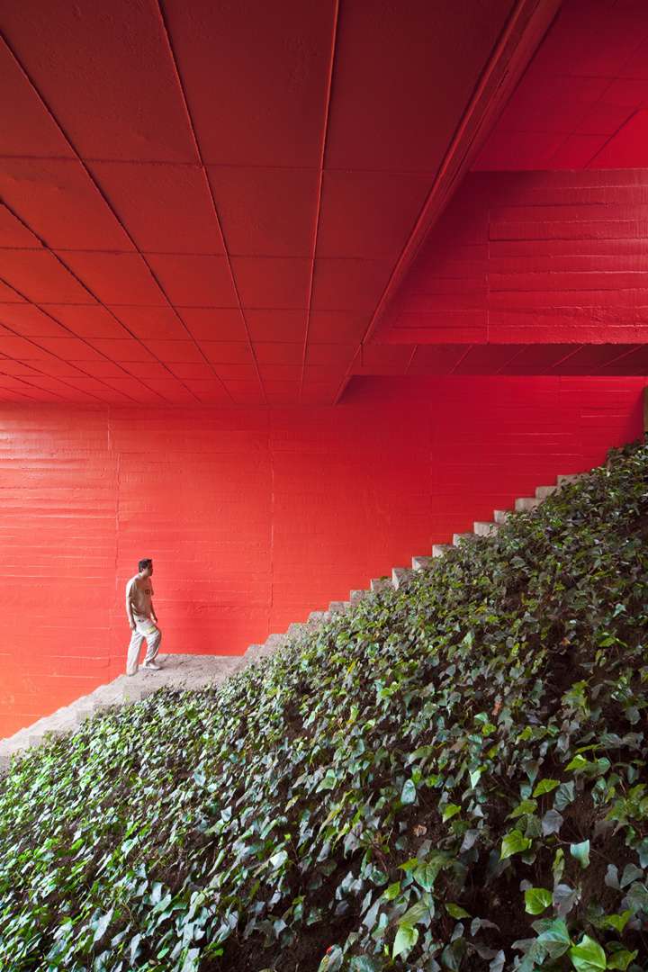 The programmatic requirements and the geographical conditions of the site –panoramic views, a steeply sloping terrain, and the need to avoid extensive digging and large retaining walls– resulted in the form of the inverted pyramid, which rests as a bridge on two walls emerging from the ground.