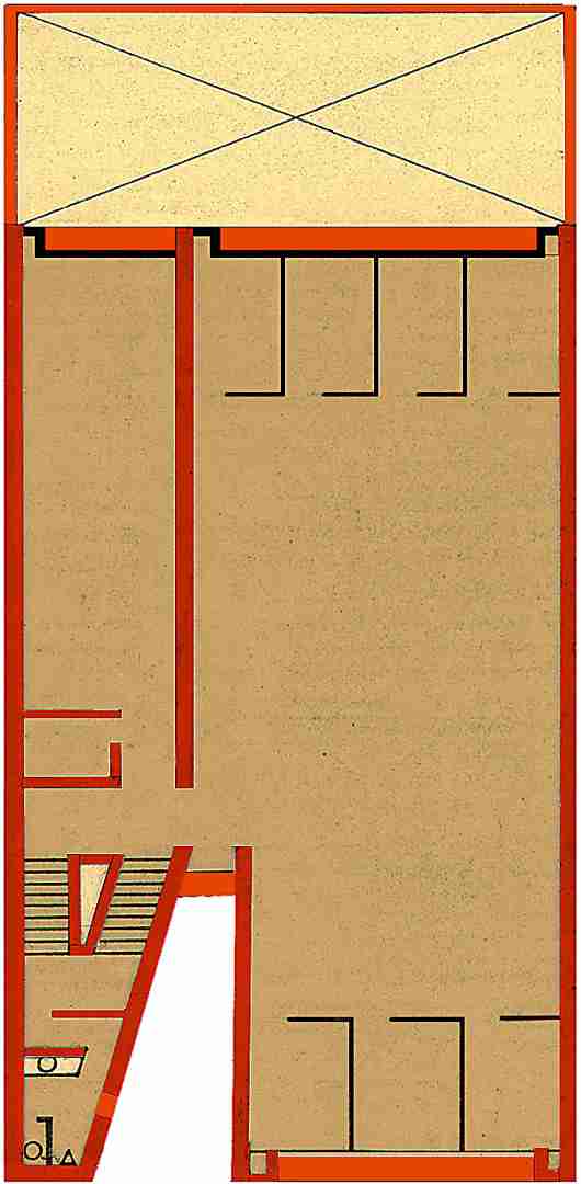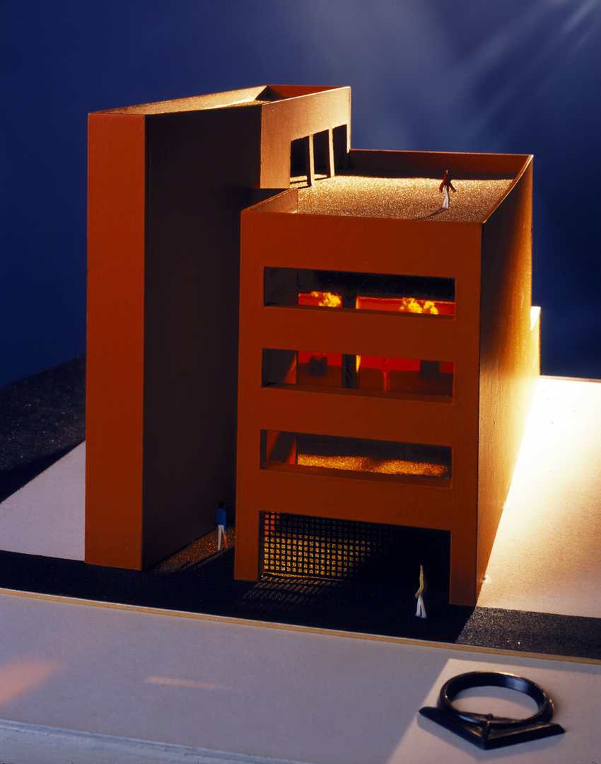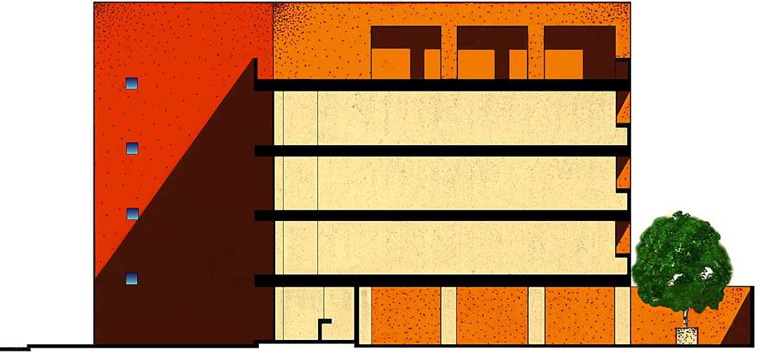 A cut resembling a slice of cake, made into the front of the building, modifies the classic typology of a boxlike volume of offices. This cut into the mass of the volume empties out the interior and allows air and sunlight to penetrate, providing the service nucleus with plenty of natural lighting and ventilation.