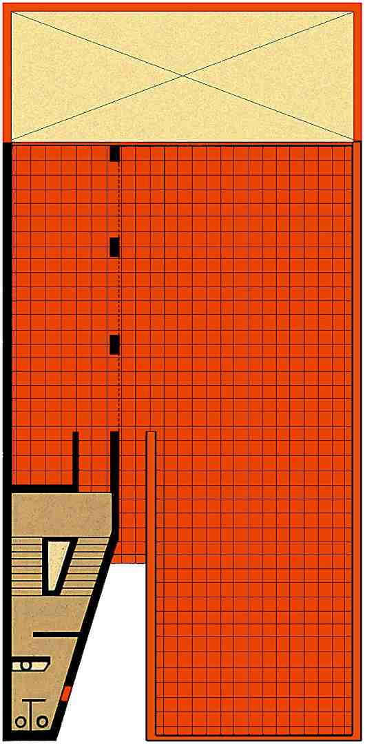 Un corte semejante al de una rebanada de pastel al frente del edificio, modificó la clásica caja de oficinas. Al realizar un corte en la masa y vaciando su interior, se posibilitó que el aire y la luz penetrase con lo cual se logró la ventilación y la iluminación naturales requeridas del cuerpo de servicios.